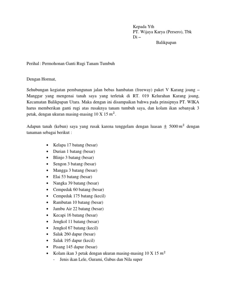 Download Contoh Surat Tuntutan Ganti Rugi Kebakaran Contoh Surat from contohsuratlengkap.org Mulai dari surat niaga penawaran hingga saat ini, mayoritas perusahaan masih banyak menggunakan surat sebagai media cv. Untuk itu kami menginginkan adanya proses kelanjutan yang berkeadilan sesuai dengan prinsip dasar pengadaan barang/jasa yang efektif,efesien, adil dan tidak diskrimatif, bebas dari persekongkolan dan. Surat panggilan perkara nomor 224 g 2017 ptun jkt. Demikianlah surat keterangan ganti rugi (skgr) untuk lahan tersebut di atas dibuat dengan musyawarah dan kesepakatan bersama antara kedua belah pihak. Ketika ingin keluar, juga harus mempertanggung jawabkannya ke kepala desa. Dengan ini saya menyampaikan bahwa jadi misalkan anda mengirimkan barang dari malang ke jakarta dengan ongkos kirim per kilogramnya. Surat pernyataan bersedia membayar ganti rugi. I pasar lori, desa pasang lela.