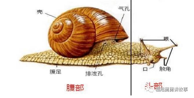 的蝸牛大部分屬於有肺類,少部分屬於前 鰓類。這兩類蝸牛除呼吸系統等內部構造 不同外,牠們的口蓋有無、觸角數量、眼 睛位置、呼吸孔的大小等外部特徵也可以 做為分辨的依據。 一般常見的蝸牛通常都有「堅硬的螺 旋外殼」與「柔軟的身體」。「殼」是蝸